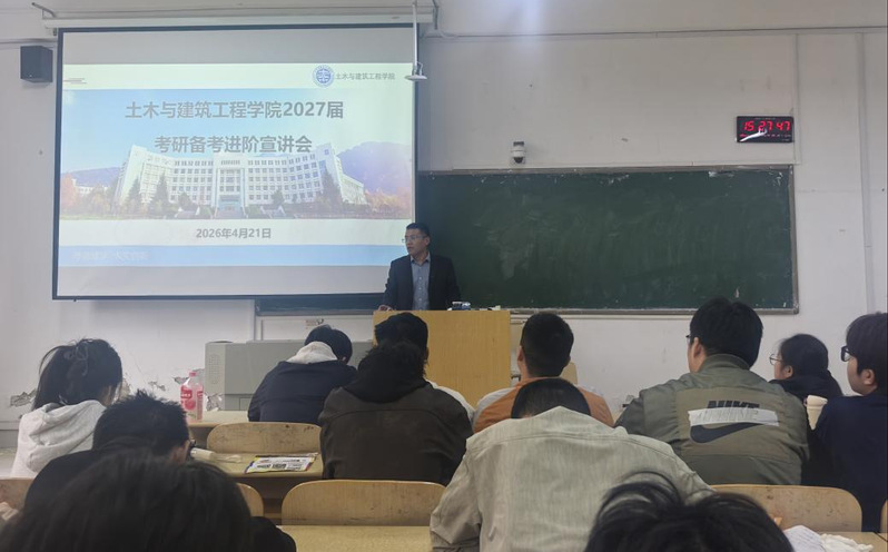 为持续深化考研指导服务,在前阶段动员基础上进一步明晰备考路径、提升复习实效,2026年4月21日,土木与建筑工程学院召开2027届考研备考进阶宣讲会。院长助理徐慧臣、专任教师高超以及2027届土木工程专业全体学生参加本次宣讲会。
